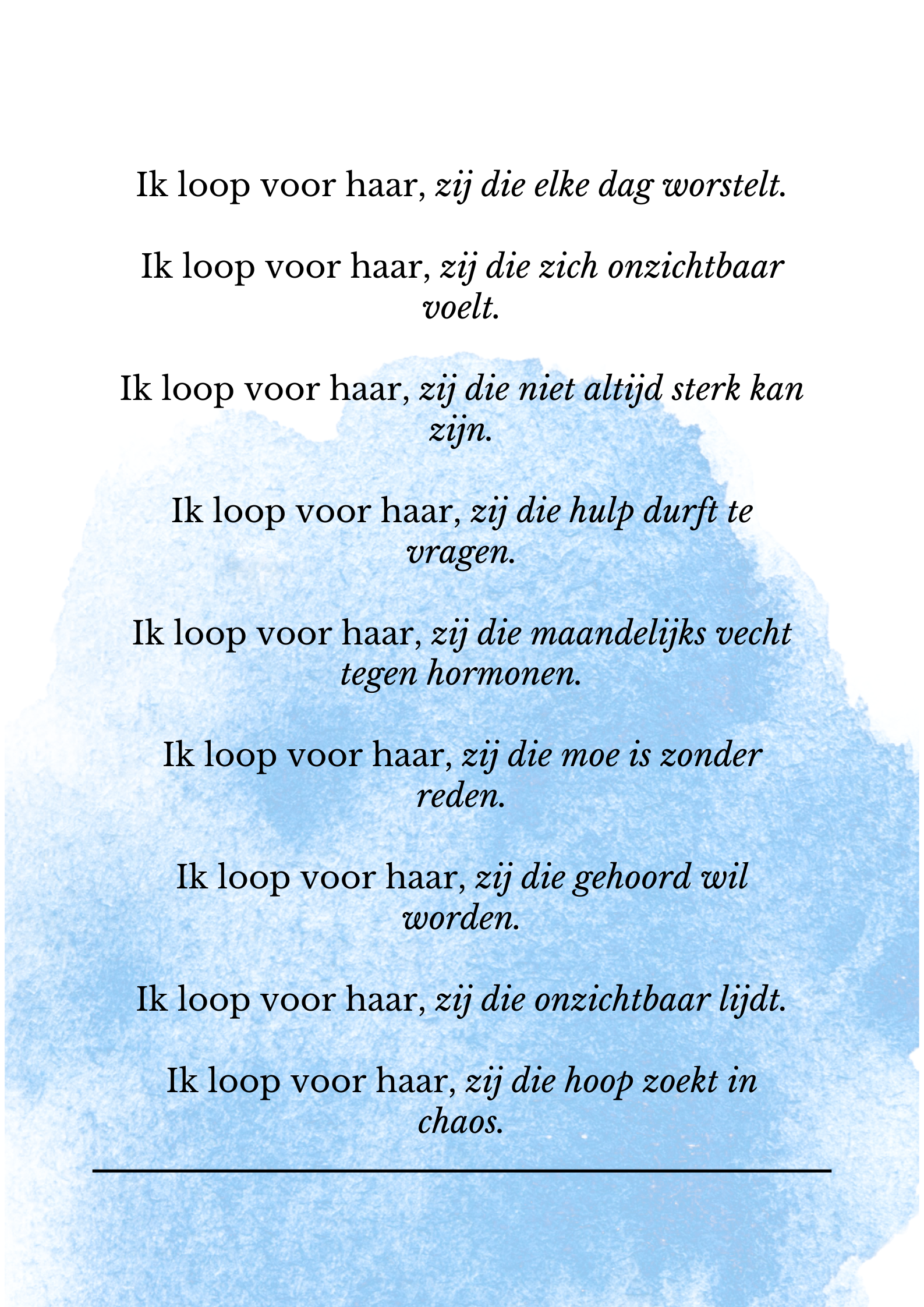 Wil je helpen? Steun mijn actie op Mijn Blue Monday run of deel dit verhaal zodat meer vrouwen weten dat ze niet alleen zijn.